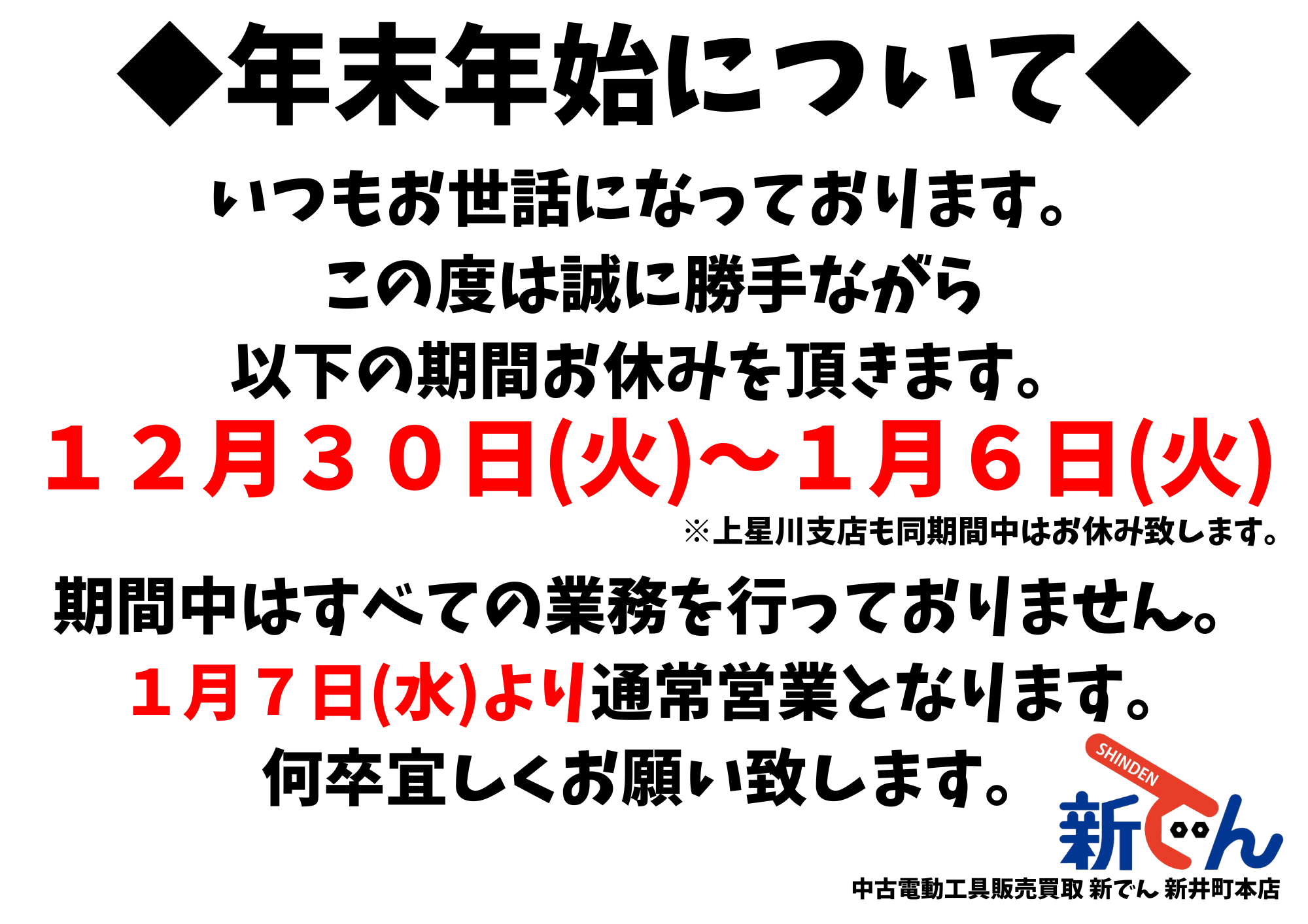 ◆年末年始について◆ お知らせ Twitter Facebook LINE コピー 2025.12.24 いつもお世話になっております。この度は誠に勝手ながら以下の期間お休みを頂きます。 12月30日(火)~1月6日(火) ※上星川支店も同期間お休み致します。期間中は全ての業務を行っておりませんのでご注意下さい。 ヤフーオークション・ヤフーショッピングの注文は可能ですが連絡、発送は全て翌営業日より順次対応となります。 1月7日(水)より通常営業致します。何卒宜しくお願い致します。