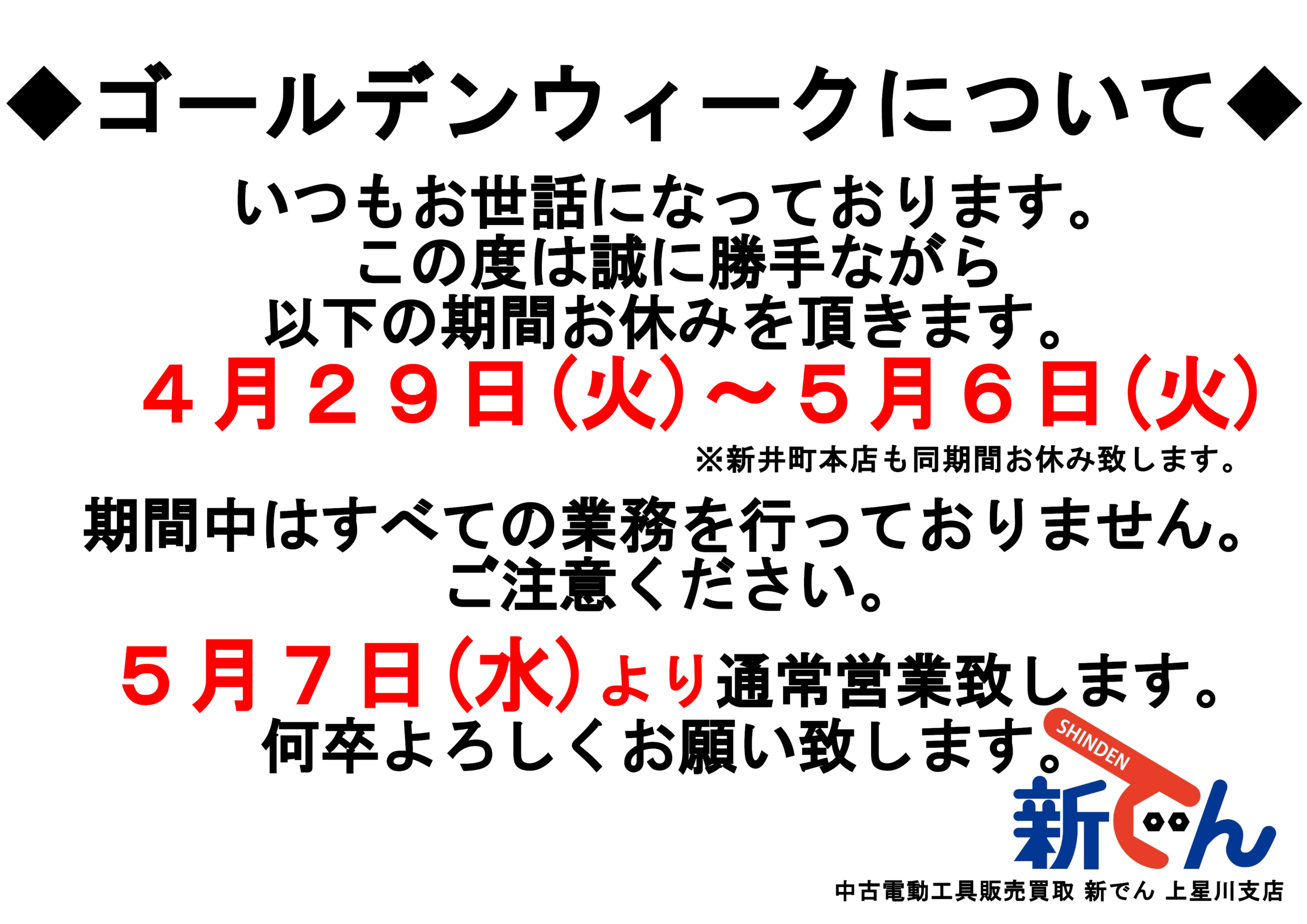 ※新井町本店も同期間お休み致します。