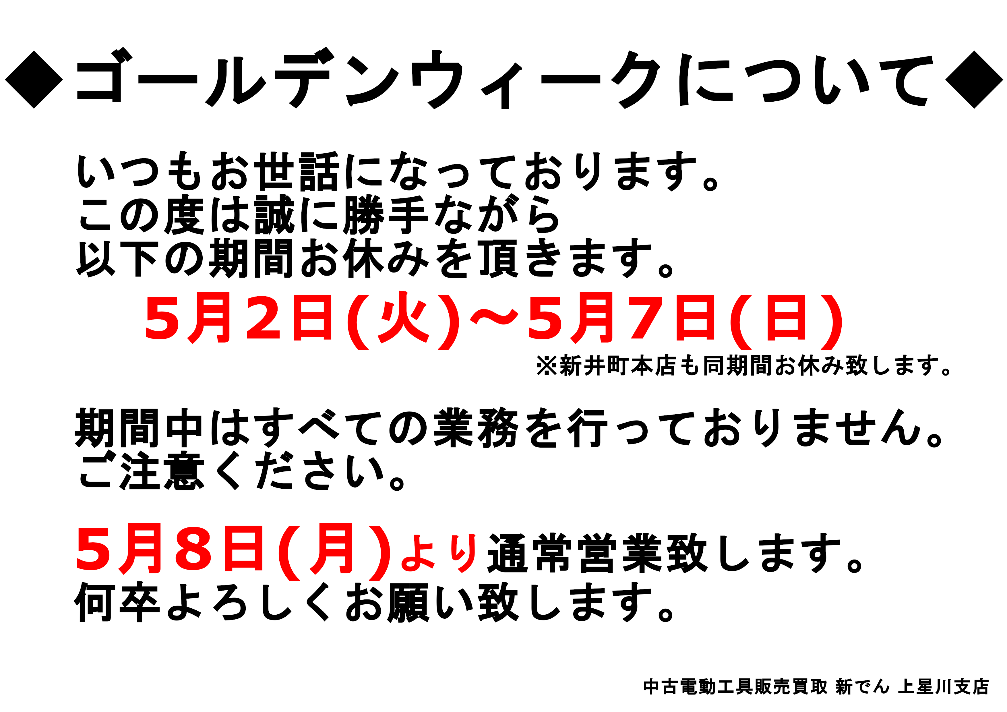 ◆ゴールデンウィークについて◆ お知らせ X Facebook LINE コピー 2023.04.30 いつもお世話になっております。この度は誠に勝手ながら以下の期間お休みを頂きます。 5月2日(火)~5月7日(日) ※新井町本店も同期間お休み致します。期間中は全ての業務を行っておりませんのでご注意下さい。 ヤフオク・ヤフーショッピングの注文は可能ですが連絡、発送は全て翌営業日より順次対応となります。 5月8日(月)より通常営業致します。何卒宜しくお願い致します。